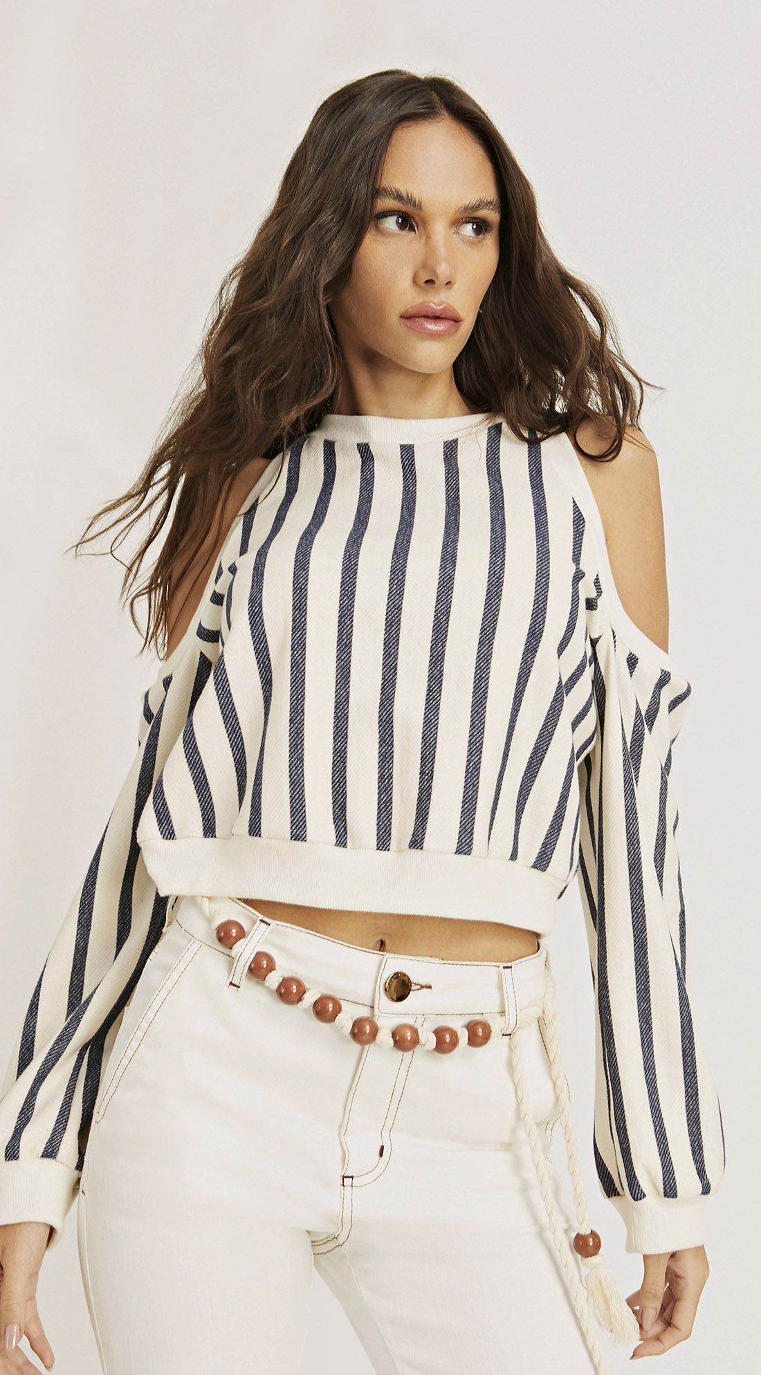 BLUSA DECOTE REDONDO LISTRADA em algodão com manga longa e pregas. O modelo com padronagem de listras, traz ao visual elegância e estilo, além de vestir muito bem. A peça aconchegante, é perfeita para compor aquele look charmoso, em dias mais frios.